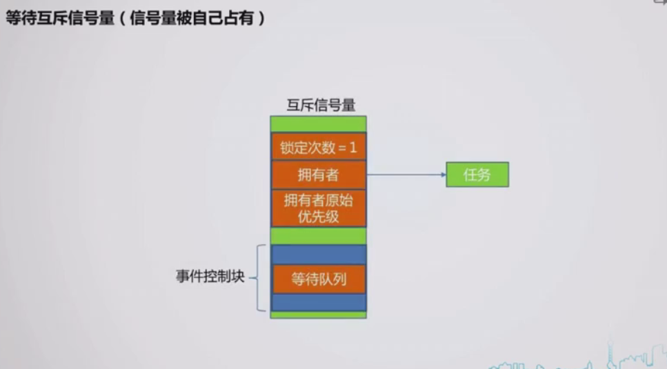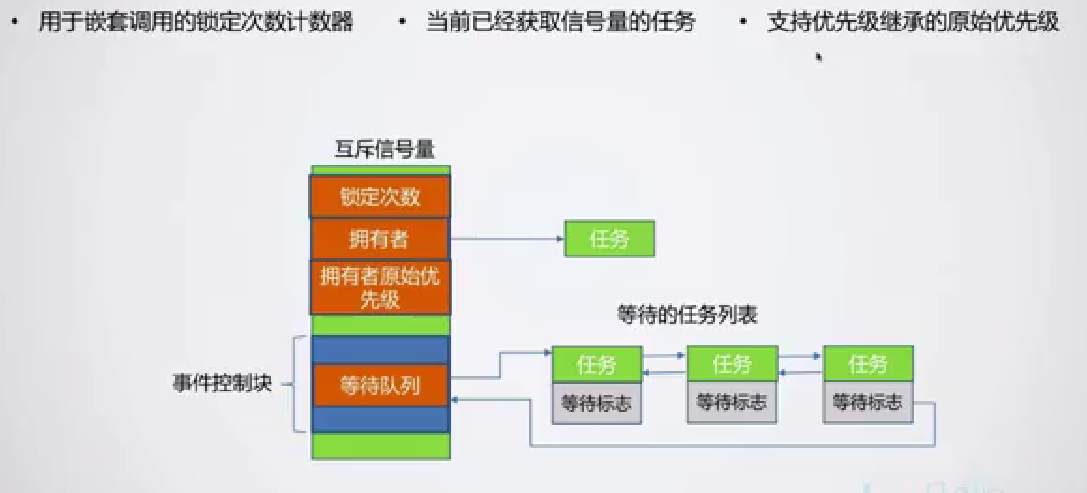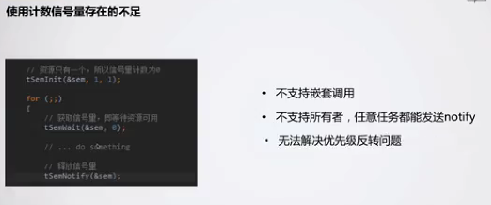 对于解决多任务共享资源冲突的问题,大致有三种解决办法,一种是关中断,这种一般冲突的是中断;第二种是调度锁,缺点和第一种一样,如果资源占用时间太长的话,会影响实时性;第三种是计数信号量,如上图,如果在嵌套的时候,同时使用了信号量并且与该信号量一样,那会被卡死,同样如果任何任务都能notify,那么安全性就会大大降低,对线程管理还说,也会有优先级反转的问题
