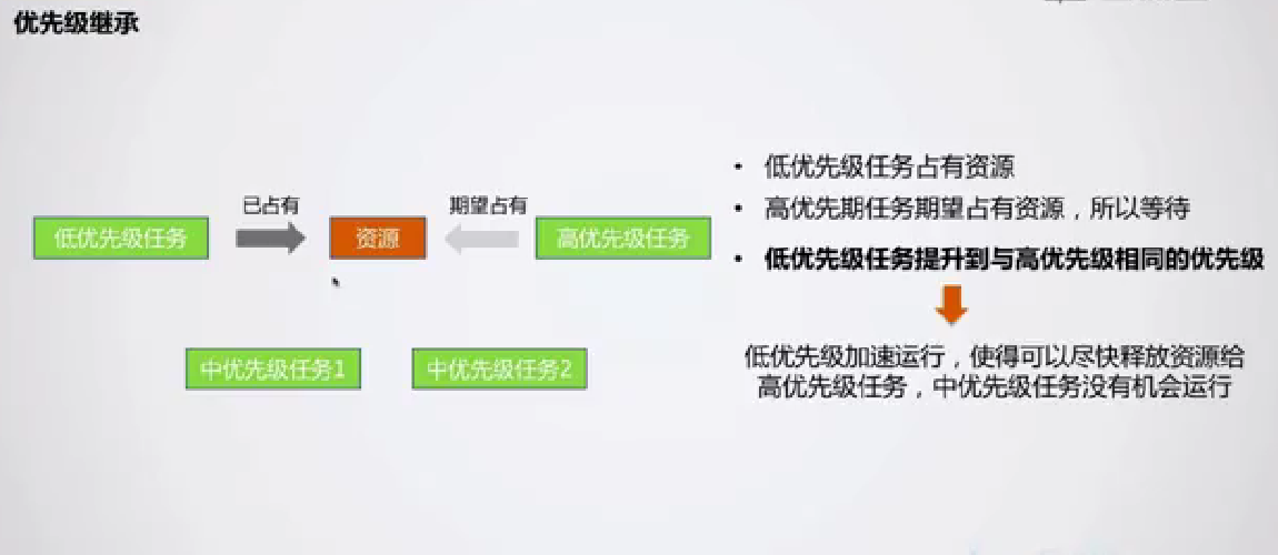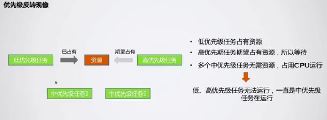 下图是优先级反转的框图,大致是低优先级占有资源,高优先级意图访问资源,但是中间有中优先级任务,这就导致了优先级最高的任务,反而最后运行