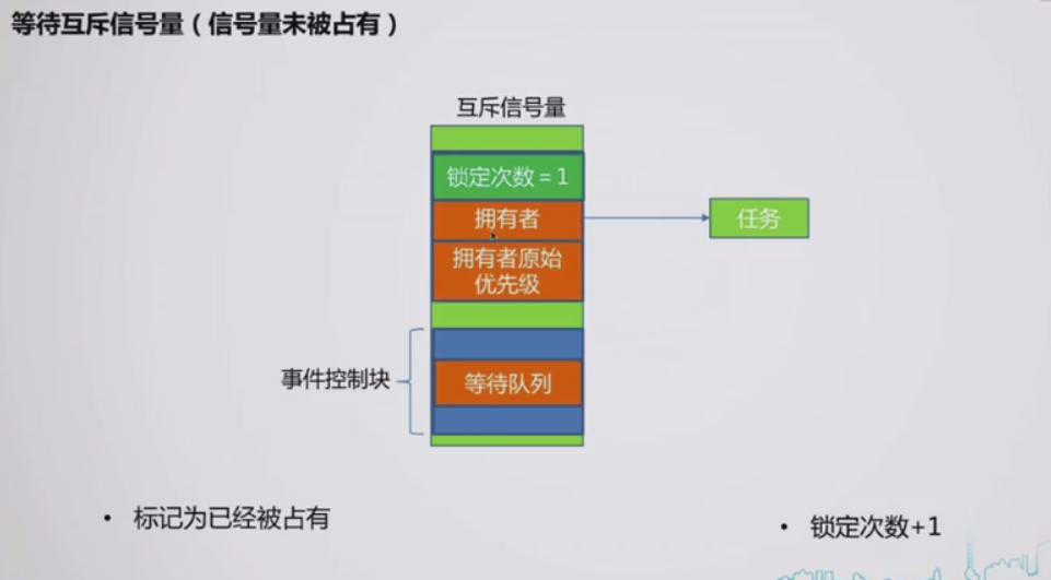 tMutexWait中,大致逻辑是先对计数判断,非正即未锁定,那么就使用当前任务锁定,如果已经被锁定了那么就执行下一步判断,也就是当前任务是信号量的拥有者还是其他,是信号量的拥有者的话就简单加加一下,是其它任务的话,就需要当前任务的优先级比拥有者优先级更高,则使用优先级继承,插入等待队列中,这里有一个细节,由于我们修改了拥有者的优先级,那么如果拥有者处于就绪态,我们就需要更改其位置