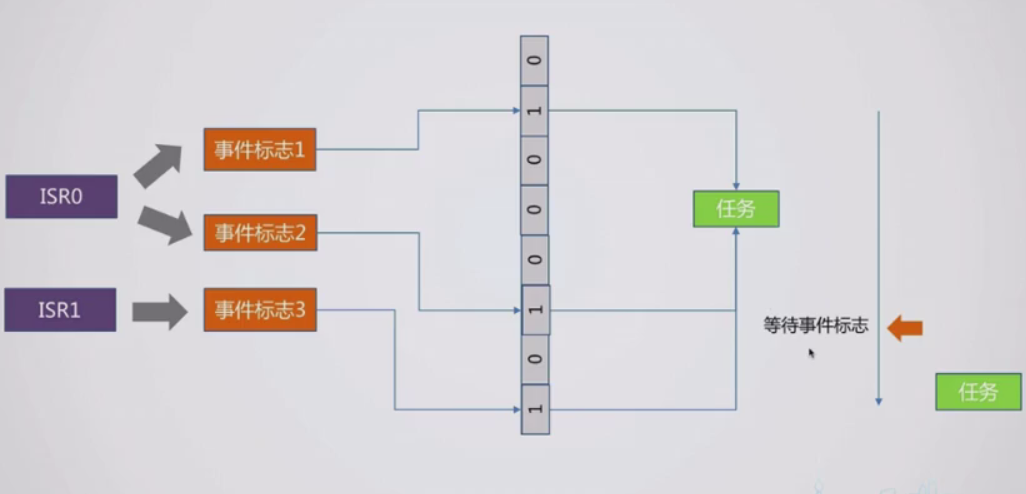 事件标志组主要是用于中断ISR和任务之间传递多个标志,当然这些标志可以有很多操作,例如基础的与或非,然后触发相应的任务