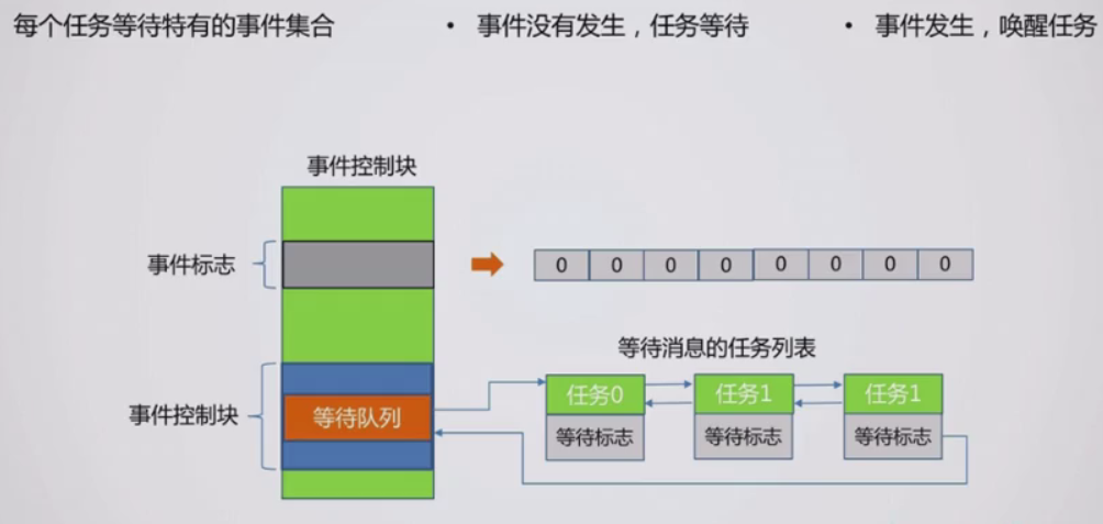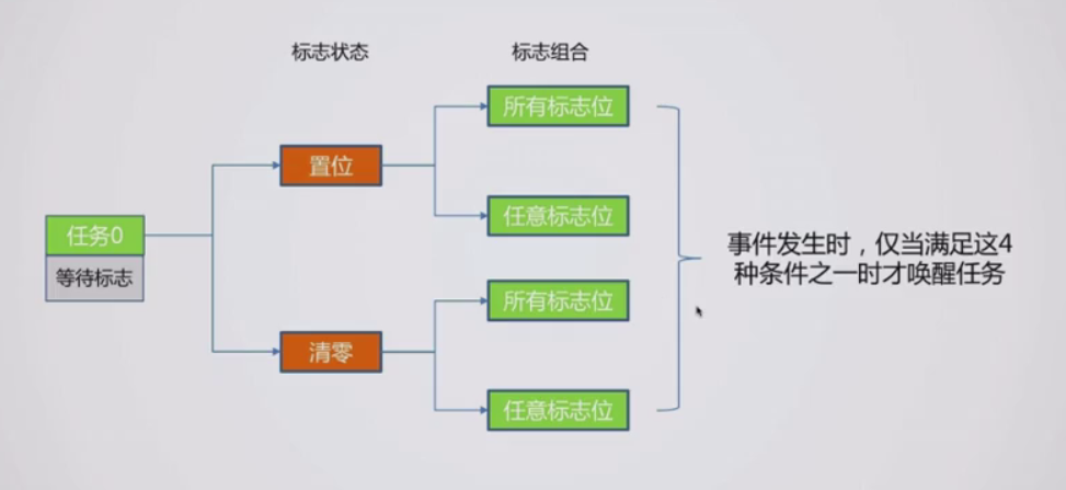 对于等待来说,任务去比较事件标志,即任务是因,如果匹配就清除继续执行,否则就插入等待队列